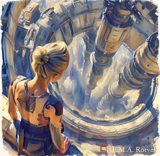 Staiga lyg veikiamos traukos jėgos, nuo bokštų, tiltų ir aikščių pakilo dulkės. Mane ištiko nuostaba – įprastai vėjas nebuvo toks stiprus. Prieš akis pamačiau šviesą, mano vėrinio holograma ėmė keistai mirgėti. Tuomet, priešais save išvydau milžinišką kosminį laivą, kadaise matytą tik vaikiškose knygose. Negalvojau, kas nutiks – puoliau artyn, negalėjau patikėti tuo, ką regiu! Laivas pradėjo leistis į apačią ir nutūpė ant žemesnės pakopos, aikštelėje. Kai išsijungė laivo variklis, tą pačią akimirką nukrito visos dulkės. Persibraukiau akis ranka, kad geriau matyčiau, vis nesustojau bėgti veikiama užburiančio smalsumo. Kai tiltu nusileidau žemyn, per pakopą, pamačiau, kaip iš laivo išlipa žmogus. Žmogus! Tik tai suvokusi, sustojau. Nebebėgau, o gaudžiau orą, lyg tas žmogus, galėtų jį pasiimti. Aš sustojau priešais žmogų! Priešais vaikiną. Mums nereikėjo žodžių. Ant jo rankos švietė numeris 744.